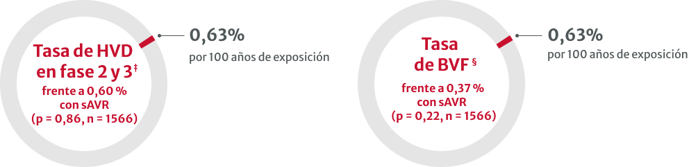 ‡ HVD en fase 2 y 3 se define como: +Δ gradiente medio ≥10 mmHg y -Δ AVA (área de válvula aórtica) ≥0,3 cm2 o ≥25 %, -Δ DVI (índice de velocidad Doppler) ≥0,1 o ≥20 % Y/O Δ RA (regurgitación aórtica) transvalvular ≥1 grado con grado final ≥moderado.