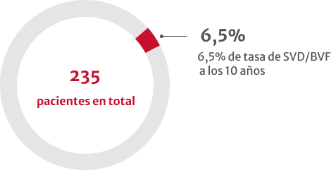 En un estudio real de seguimiento a largo plazo (n = 235‖), el 93,5 % de los pacientes que se sometieron a TAVI no presentaron deterioro estructural de la válvula (SVD) ni BVF a los 10 años, y solo 2 necesitaron una reintervención.2