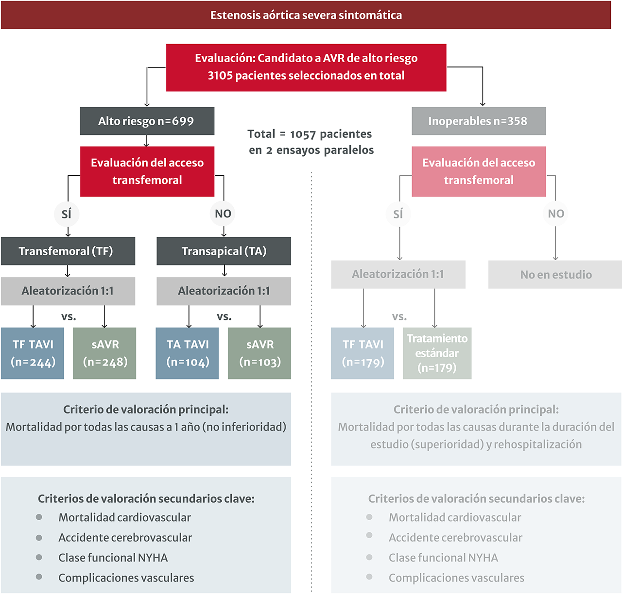 - Un ensayo amplio y multicéntrico que reclutó a pacientes con estenosis aórtica severa (EAS) de riesgo alto y los aleatorizó a TAVI o sAVR
