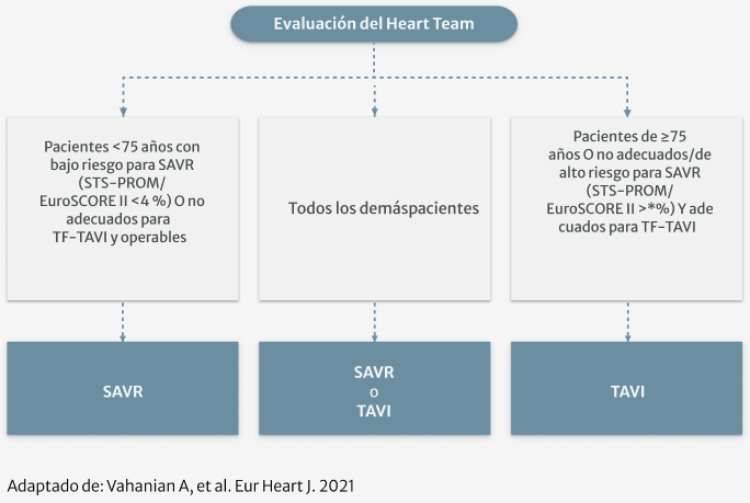 - La mayoría de los pacientes asintomáticos deberán seguir bajo vigilancia para su reevaluación periódica. No obstante, en casos especiales, algunos pacientes podrían derivarse al Heart Team para tratar su estenosis aórtica4