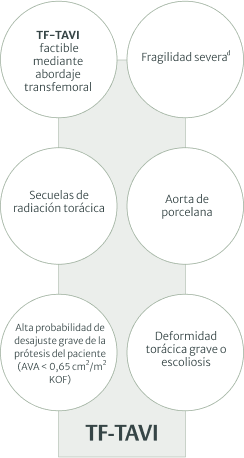 e EAC multivaso significativa que requiere revascularización quirúrgica, valvulopatía mitral primaria severa, valvulopatía tricúspide severa, dilatación/aneurisma significativa de la raíz aórtica y/o de la aorta ascendente e hipertrofia septal que requiere miectomía. EA: estenosis aórtica; AVA: área de la válvula aórtica; BSA: área de superficie corporal; EuroSCORE: Sistema Europeo de Evaluación del Riesgo Operativo Cardíaco; VI: ventrículo izquierdo; STS-PROM: riesgo de mortalidad previsto por la Sociedad de Cirujanos Torácicos; TAVI: implantación de válvula aórtica transcatéter; TF: transfemoral