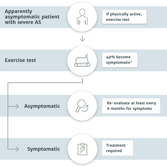 - The majority of asymptomatic patients should be put on watchful waiting and periodically re-evaluated. However, in special cases some patients may be referred to the Heart Team for treatment of their aortic stenosis4